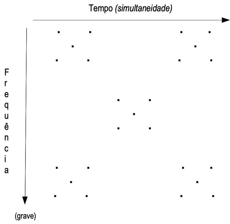 Eu e Paulo Gomide Cohn, cuidaríamos da parte musical do projeto e resolvemos investigar mais a fundo as pesquisas e implementações já existentes no terreno da música fractal. O que encontramos foi o trabalho de Charles Dodge “Fractals and Music” no Computer Music Journal. Neste artigo ele descreve a implementação de um algoritmo fractal dos mais simples : o floco de neve (snow flake). A relação do algoritmo com a música se dá de forma direta : ao escalamento corresponde a divisão da duração das notas, a similaridade com a pura e simples transposição de frequências, e a ocupação do espaço com a densidade dos eventos musicais no eixo do tempo.