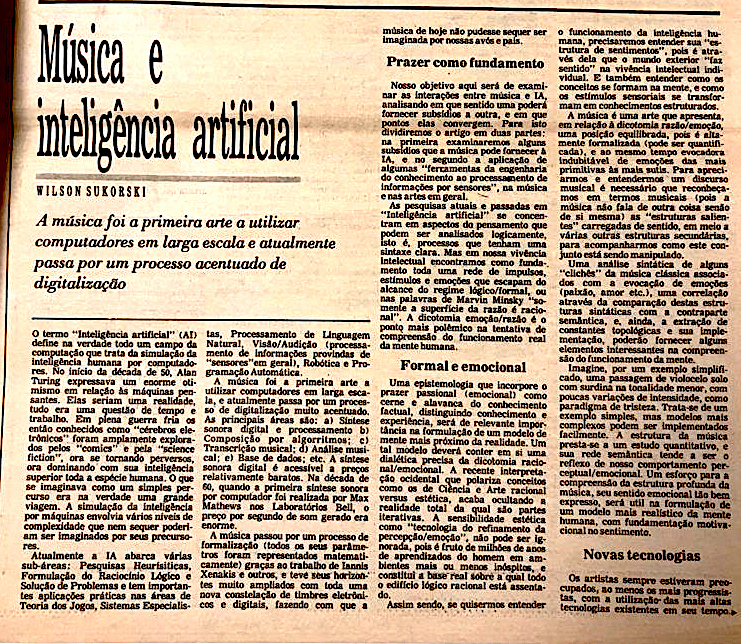 Das muitas visitas que realizei no MIT uma das mais inesquecíveis foi o contato que tive com o grande pensador, matemático, pai da Inteligência Artificial e prêmio Nobel – Marvin Minsky, na época muito interessado nas relações entre música e inteligência artificial. Eu vinha desenvolvendo o projeto “UNDERGARDEN” onde várias formas de ciclos naturais eram usados para a geração e manipulação de sons. Automatismos naturais, isto é, as forças da natureza utilizadas como controle de instrumentos musicais mais ou menos eletrônicos, numa instalação de Arte Pública. De volta a São Paulo, fui convidado a participar de uma mesa redonda de discussão durante o I Simpósio Brasileiro de Inteligência Artificial, realizado no Instituto Militar de Engenharia no Rio de Janeiro. Nesta ocasião, meu colega de mesa era o matemático Walter Carnielli, então orientador do grupo de Inteligência Artificial do CTI – Centro Tecnológico para a Informática de Campinas, também ligado ao setor militar. Walter me convidou a participar do Grupo de Sistemas Especialistas (expert systems) do CTI. Meu interesse era a criação de um sistema de composição automática controlado por sensores, derivados de minhas pesquisas realizadas para a FUNARTE em 83 : SMED Sistema de Música Eletrônica Digital. Após uma reunião com o grupo, formatei a idéia do projeto Música Pessoal, que foi apresentado por mim para a curadora de música da 19a. Bienal Internacional de São Paulo, Ana Maria Kieffer.