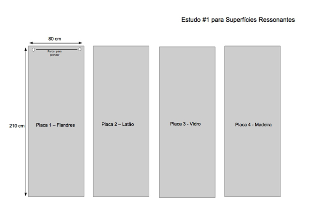 A instalação é formada por 4 placas finas (.5 cm) com 210 cm de comprimento por 80 cm de largura. Estas placas estão presas por cabos de aço a dois furos na parte superior. Várias disposições das placas são possíveis. Propomos para esta primeira abordagem placas em latão (cobre + zinco), flandres (ferro + aço + estanho), vidro reciclado e madeira tratada. Cada material tem um coeficiente de vibração relativo ao peso (massa) e elasticidade.
