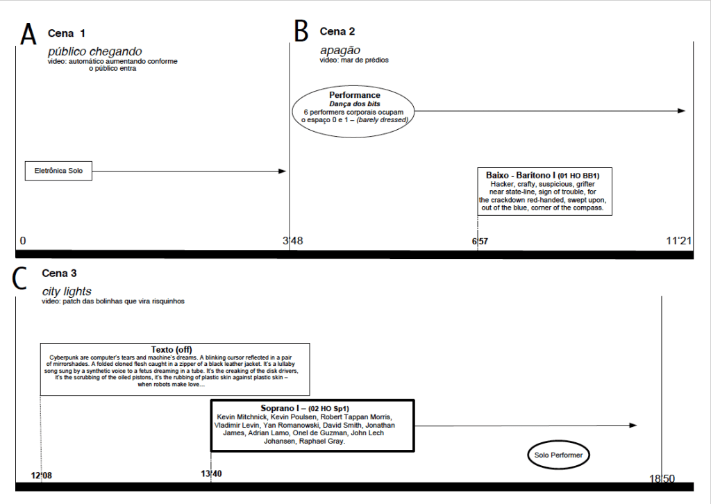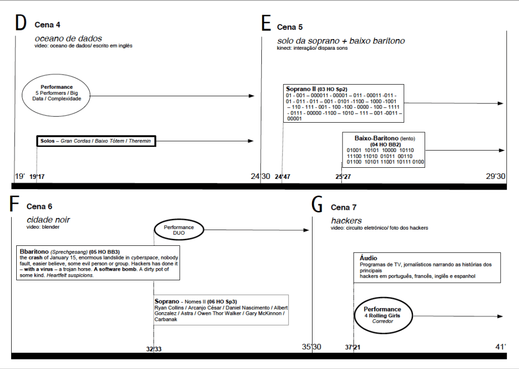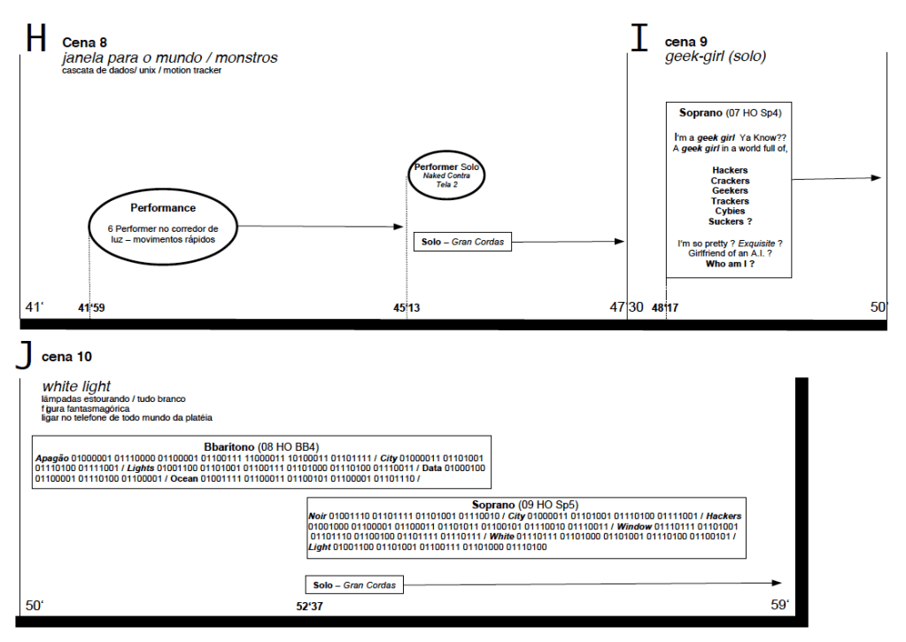 Abaixo a partitura gráfica de controle para a realização da HO. A ópera está dividida em 10 Cenas (A a J). Cada cena é claramente diferente da anterior e posterior em “mood“, cenografia, figurinos, iluminação, computação gráfica, performance, etc. A partitura está organizada em minutos e segundos (escritos no rodapé). Para a montagem : solicitar a trilha eletrônica composta por Wilson Sukorski, disponível em 4.1 (quadrafônico + sub woofer), ou estéreo, assim como as partituras tradicionais para soprano e baixo barítono (de complexidade média/alta) – que podem ser solicitadas em wilson@sukorski.art.
