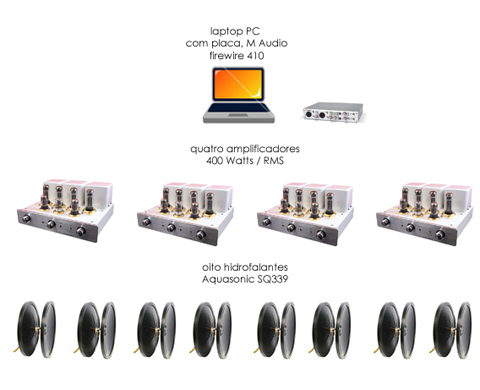Assim o projeto é apreciado apenas em situação de imersão/mergulho. O sistema dos 8 hidrofalantes forma um ambiente inusitado fazendo uso de projeções sonoras octafônicas. Um robô-sample-player com 8 saídas sincronizadas e pré amplificação – sorteia as amostras comumente de forma aleatória, mas pode ser programado de outras maneiras – em sua memória estão arquivadas o equivalente a 8 horas de sons e musicas originais compostas para o projeto.