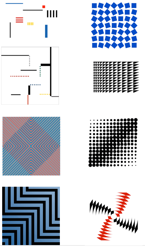 Abaixo algumas das obras de Luiz Sacilotto, escolhidas para sonificação artística, i.e. acrescentar mais camadas sígnicas : a sonora/temporal via movimento de tocar, a da transformação gradual ou abrupta, a localização na panorâmica – ao movimento puro da geometria das obras.